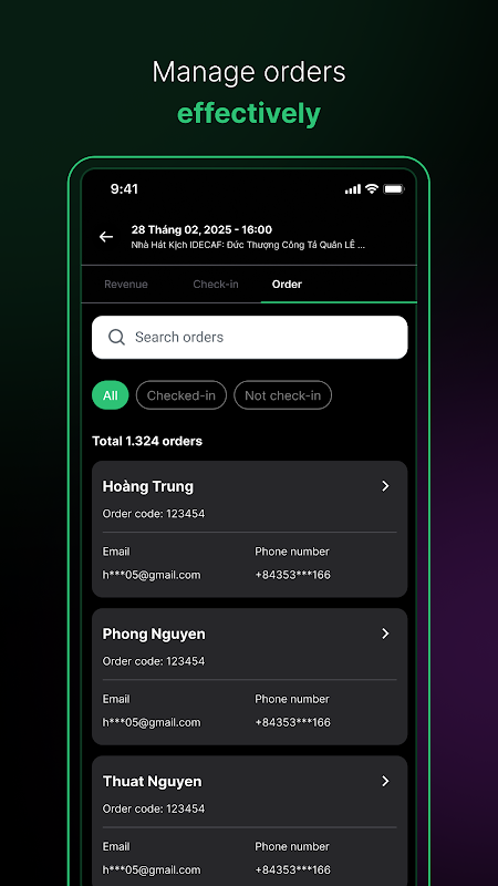 - Gestión y seguimiento de todas las órdenes de billetes, información del cliente y checkins para sus eventos