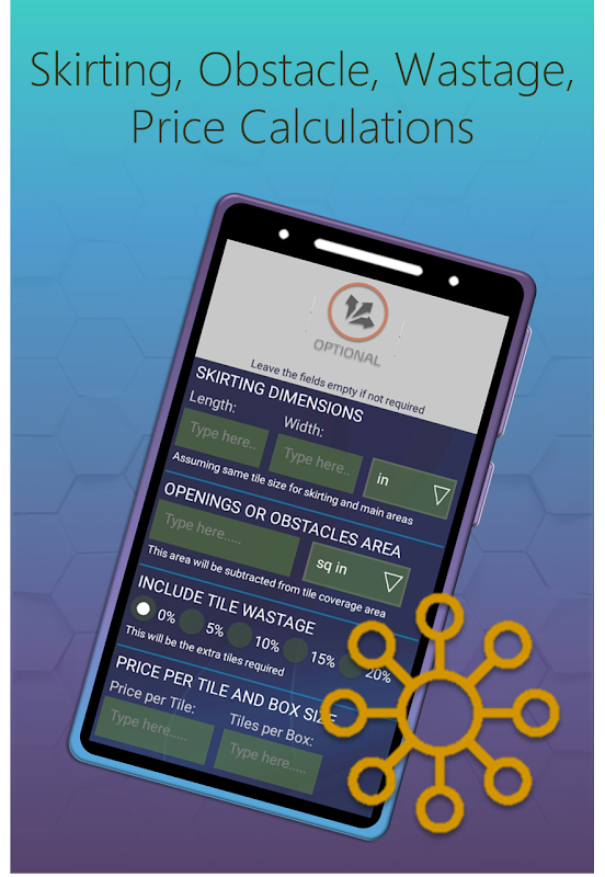Calcule fácilmente los materiales y el costo necesarios con esta sencilla aplicación. Tile Calculator es una aplicación fácil de usar para calcular la cantidad de mosaicos, adoquines, tablones o cualquier unidad repetida para cubrir un área de superficie determinada, como un piso o una pared. Puede manejar patrones de mosaicos individuales o múltiples patrones de mosaicos con un máximo de 10 mosaicos. Para baldosas cuadradas y rectangulares, se admite el espacio de lechada, incluido el cálculo. El área de una sola baldosa se puede dar como el área total para todas las formas de baldosas no rectangulares o calcularse usando sus dimensiones para baldosas rectangulares / cuadradas. El área de cobertura también se puede ingresar de manera similar. Además, cualquier área de cobertura con forma de triángulo, círculo, rectángulo, cuadrado y polígono regular se puede calcular fácilmente dentro de la aplicación. Esta aplicación admite 6 unidades de longitud y área de uso común y el usuario tiene total flexibilidad para usar cualquier combinación de unidades para los cálculos. Esta aplicación es completamente gratuita y no utilizamos publicidad. La aplicación tiene una interfaz de usuario bastante simple e intuitiva que está diseñada considerando todos los grupos de usuarios y se puede usar con una amplia variedad de dispositivos con pantallas pequeñas y grandes.