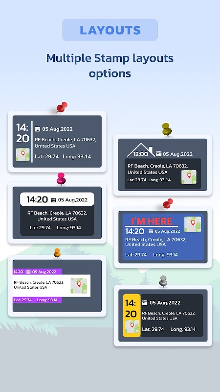 - Vista de mapa, dirección actual, ubicación, fecha y hora y lat-lng disponibles en múltiples diseños.