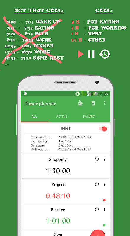 Начинайте, останавливайте, продолжайте таймер тогда, когда вам удобно, и не тратьте ни минуты лишнего времени!
