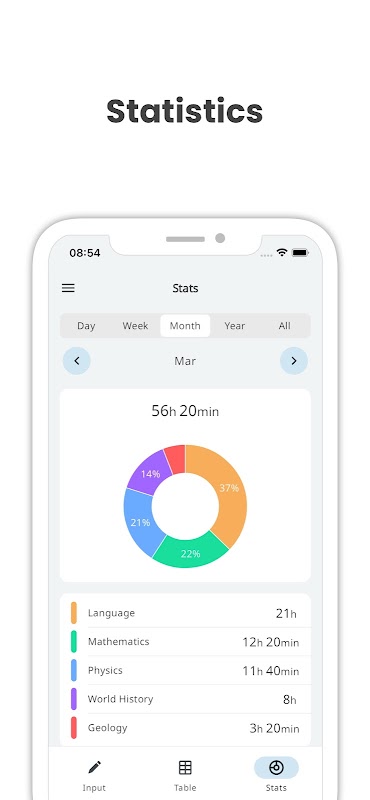 En la pantalla de estadísticas, puede analizar el tiempo invertido por categoría mediante gráficos circulares y de barras.