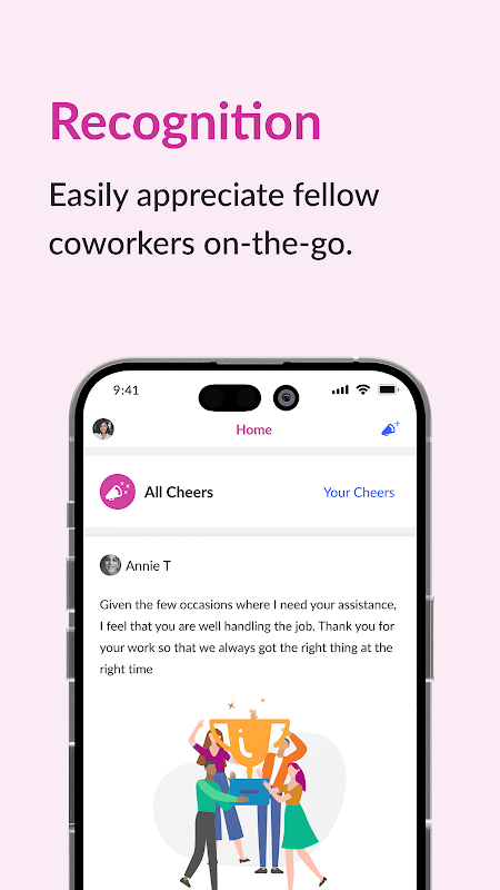 - Enviar o ver el reconocimiento de pares a través de Cheers for Peers.