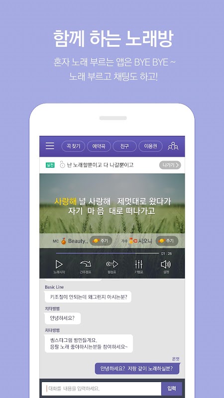 여러 친구들과 함께 실시간으로 노래도 부르고 듣고 점수도 직접 주는 라이브 노래방 서비스 입니다.