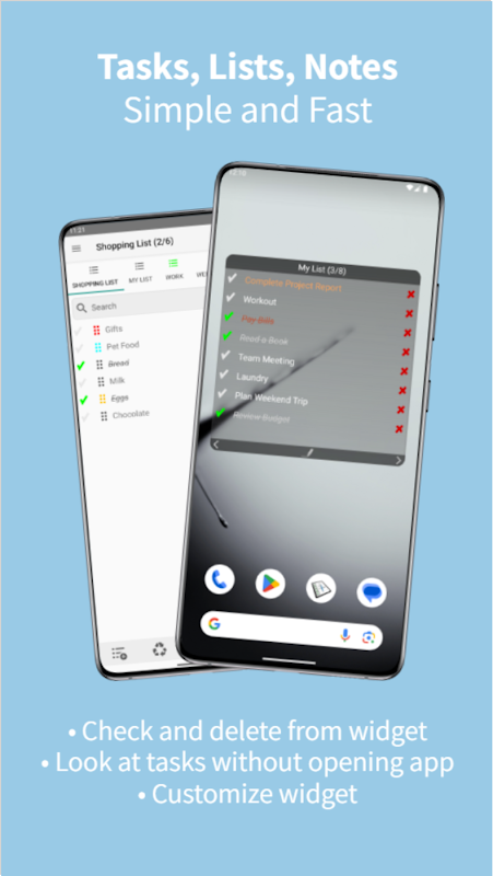 Las notas, las tareas pendientes y las listas de verificación múltiples también se pueden marcar como hechas y eliminarse directamente del widget. Perfecto para listas de compras rápidas y simples, tareas para el día y recordatorios de tareas.