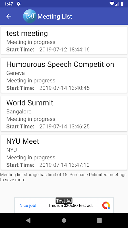 2) La lista de reuniones almacena los detalles de todas las reuniones pasadas (límite: 15)