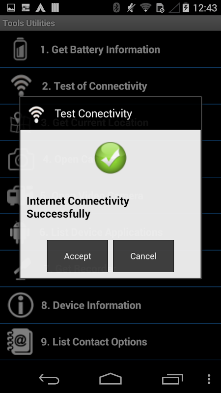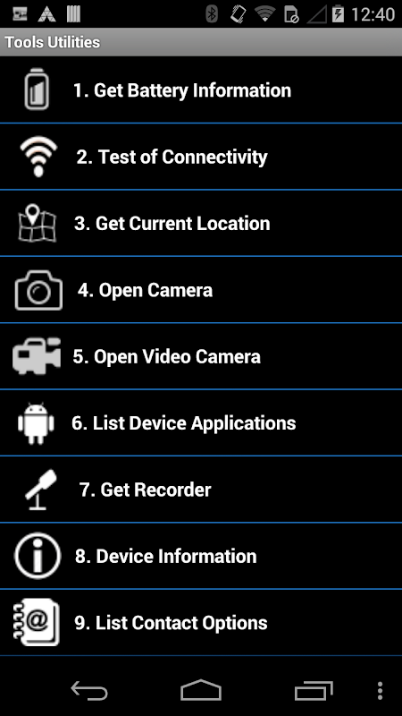 Util app de utilidades y herramientas en android como las siguientes: obtener informacion del estado de la bateria, test de conectividad,Actual ubicacion en coordenadas, abrir camara, abrir video, administracion de aplicaciones, grabador de sonido, informacion del dispositivo, contactos, historial web, busqueda de redes wifi, historico de llamadas