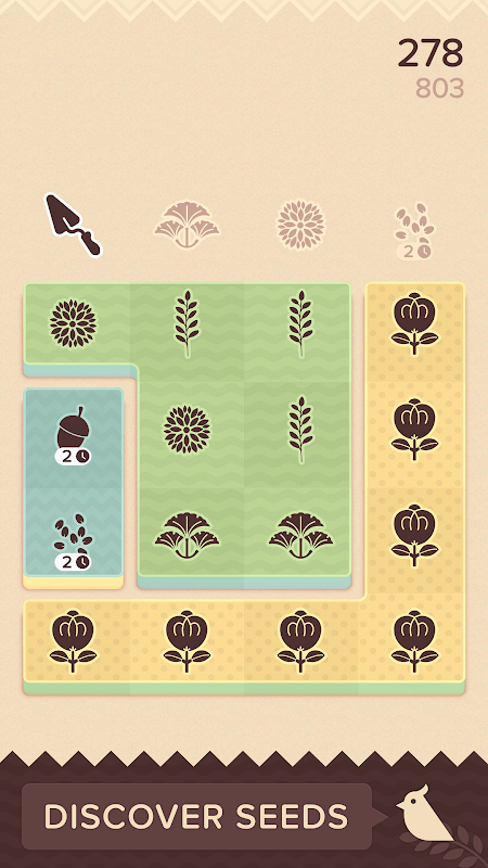 ¡Tu objetivo es cosechar tantas plantas como puedas antes de que tu jardín se llene! Gestiona tu jardín colocando plantas del mismo tipo una al lado de la otra y luego coséchalas juntas. Cuantas más plantas coseches a la vez, más puntos ganas y más tierra remueves. Si tu jardín se llena antes de tu próxima oportunidad de cosechar, se acabó el juego. ¡Sigue creciendo y descubrirás nuevas semillas, árboles altos y pájaros amigables en el camino!