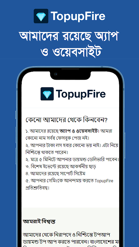 Hay algunas formas de recargar diamantes ff. TopupFire es el confiable que entrega diamantes ff en unos pocos minutos. Nuestra aplicación de recarga de diamantes es compatible con el idioma bengalí, lo cual es útil si eres un nuevo jugador de Bangladesh.