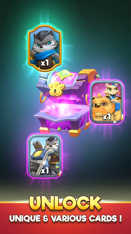 ¡Puedes usar cartas duplicadas ganadas luchando para hacer que la carta original sea más fuerte! Los múltiplos de la misma carta se usan para aumentar el nivel y las estadísticas de esa carta. ¡Sigue luchando para recoger más y más cartas para fortalecer a tus adorables amigos animales en la lucha! ¡Nunca está de más tener cartas extra!