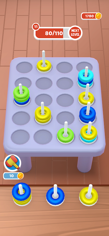 - Mecánica de toque simple: controla el juego sin esfuerzo con un simple toque para seleccionar y colocar los anillos.