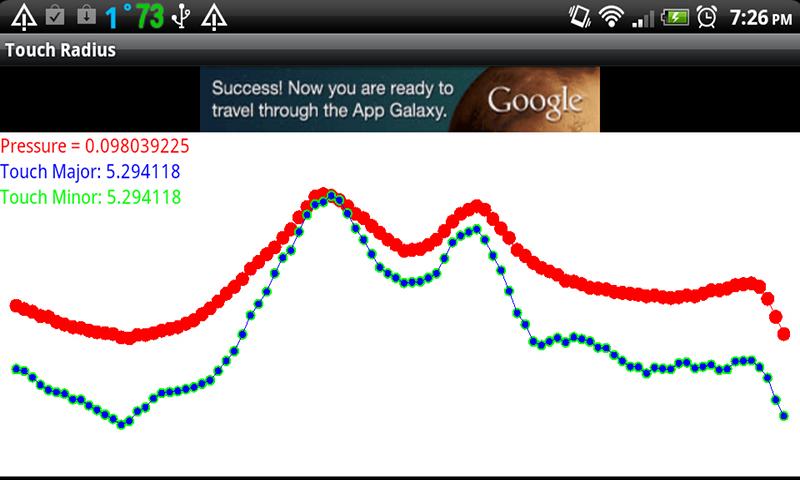 This app graphs the touch major/minor radii, and pressure values received from one touch. As you can see from the screen shot on my phone the touch major & minor radius are the same values, and pressure follows along the sizes.