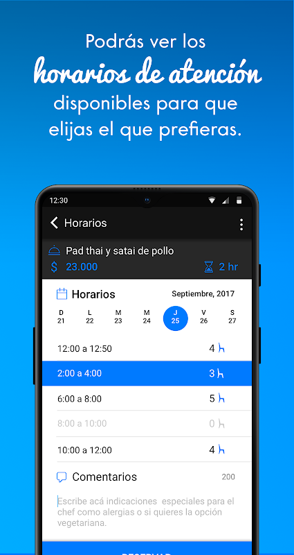 Selecciona el menú y el horario que más te guste y reserva tu espacio de manera rápida y fácil.