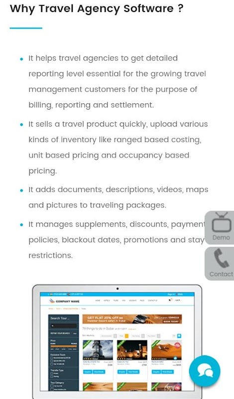 Technoheaven’s tour operator software helps travel agencies to obtain a detailed reporting level required for the expanding travel management customers for the purpose of billing, reporting and settlement. It sells a travel product speedily; uploads various kinds of inventory like range based costing, unit as well as occupancy based pricing. It enables you to add documents, descriptions, videos, maps and pictures to highlight product information on your website. It manages supplements, discounts, payment policies, blackout dates, promotions and stay restrictions.