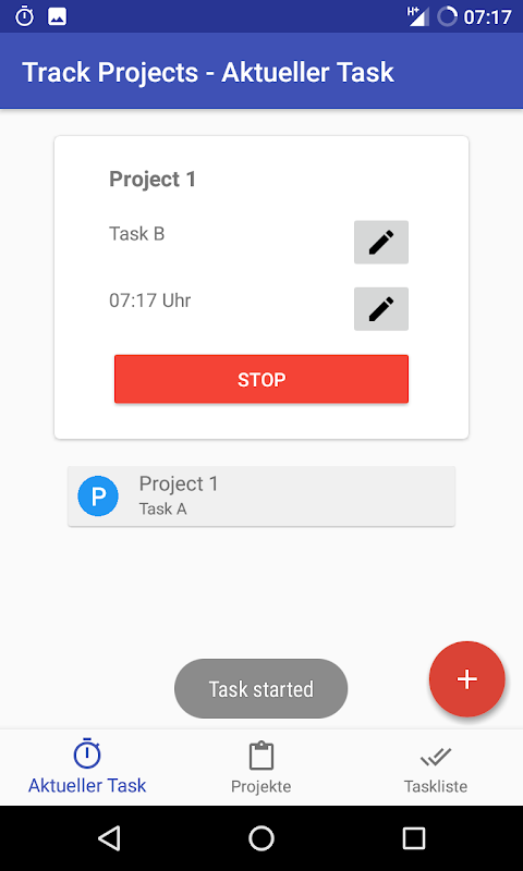 In der App kann man Projekte anlegen und zu jedem Projekt Tasks starten.
