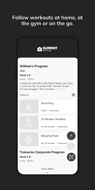 ¡Con la aplicación Train with Summit, tendrás acceso a programas de entrenamiento diseñados específicamente para ayudarte a alcanzar tus objetivos de salud y fitness! Puedes seguir y realizar un seguimiento de tus entrenamientos, tu nutrición, tus hábitos de estilo de vida, mediciones y resultados, todo con la ayuda de tu entrenador.