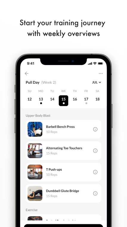 Desde allí, deslice una pestaña hasta el calendario de ejercicios que actuará como su planificador de entrenamiento diario. Cuando su entrenador le asigne un plan de acondicionamiento físico, le pida que se pese, realice un seguimiento de sus macros nutricionales diarias o solicite una foto de progreso, encontrará esa lista de tareas pendientes aquí. Al hacer clic en el entrenamiento del día, accederá directamente al primer ejercicio de su programa de acondicionamiento físico.