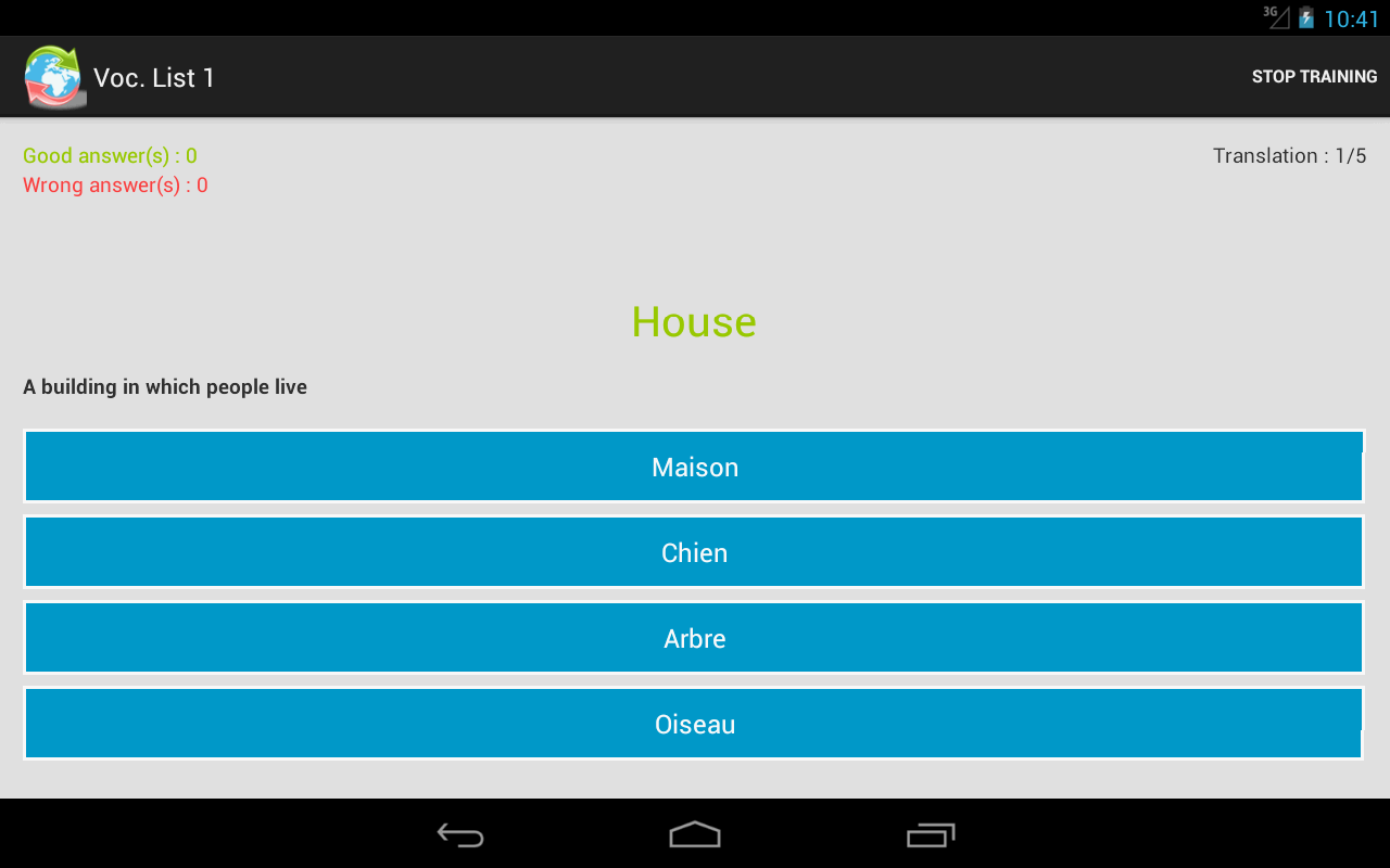 - El modo de prueba: La aplicación recoge una palabra al azar y cuatro respuestas posibles. Usted debe elegir la correcta.
