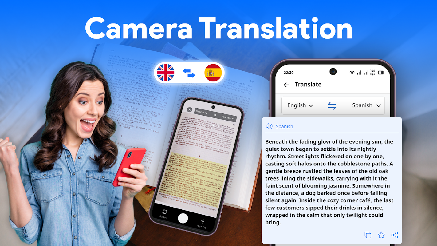 Apunta con la cámara a cualquier texto y el traductor de fotos leerá, detectará y traducirá al instante. Útil para leer letreros, libros o etiquetas en diferentes idiomas, gracias a sus herramientas de traducción inteligentes.