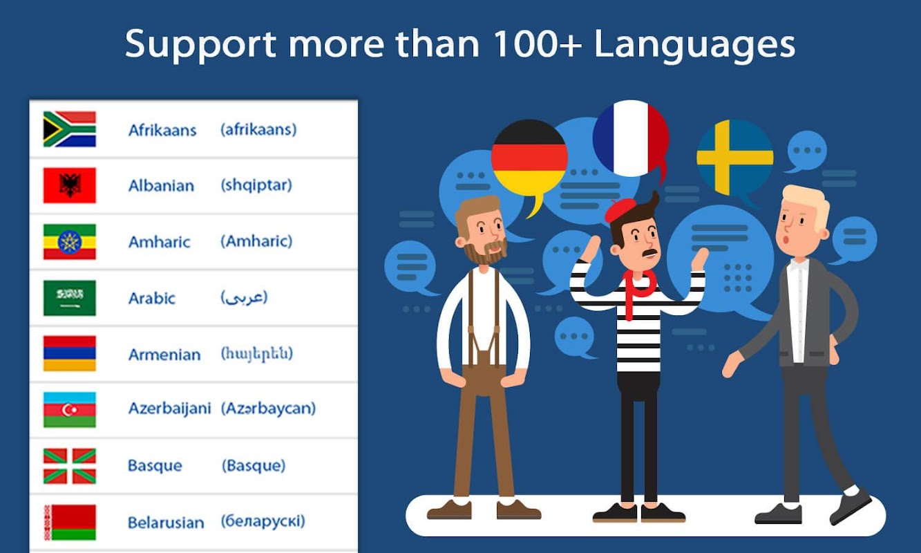 Todas las aplicaciones de traducción admiten más de 80 idiomas, sin barreras de comunicación. Puede traducir fácilmente el texto de la foto escaneando el texto con el traductor de la cámara, luego elija su idioma para traducir el texto, el traductor de imágenes le proporcionará la mejor traducción precisa del texto. Si desea traducir la voz, nuestro traductor de Android para voz siempre es mejor como traductor de sonido de voz.