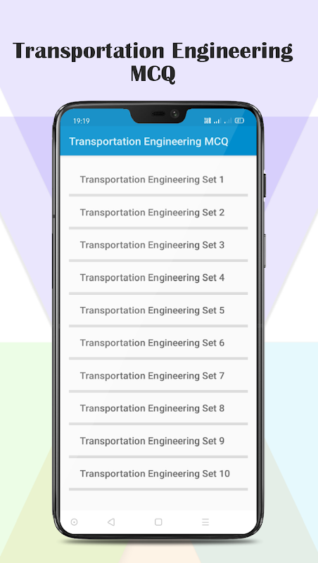 La aplicación contiene 15 conjuntos de preguntas de opción múltiple de ingeniería de transporte
