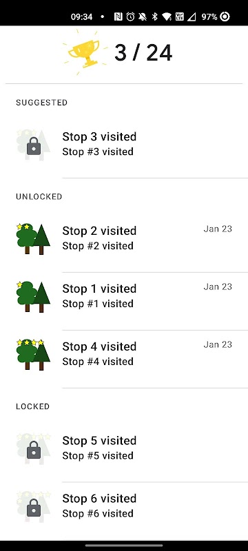 Pruebas locales: (funciona solo si el modo de desarrollador de Android está desbloqueado) vaya a las preferencias y active las pruebas locales. Reinicie la aplicación y completará algunas paradas de los metadatos de caminata de CSU Fresno, pero modificará las coordenadas GPS para colocarlas delante de usted a 10 m de distancia en línea recta. Geo-cercas de ~5m.