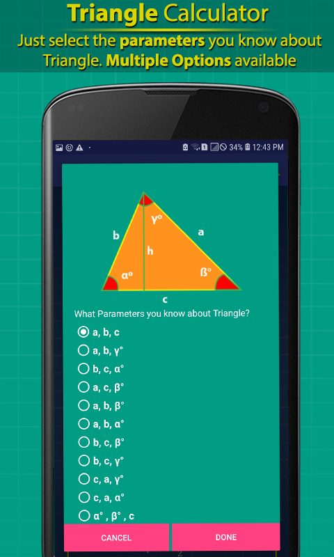 Esta Calculadora de triángulos puede resolver Triángulo fácilmente con solo hacer clic en el botón.