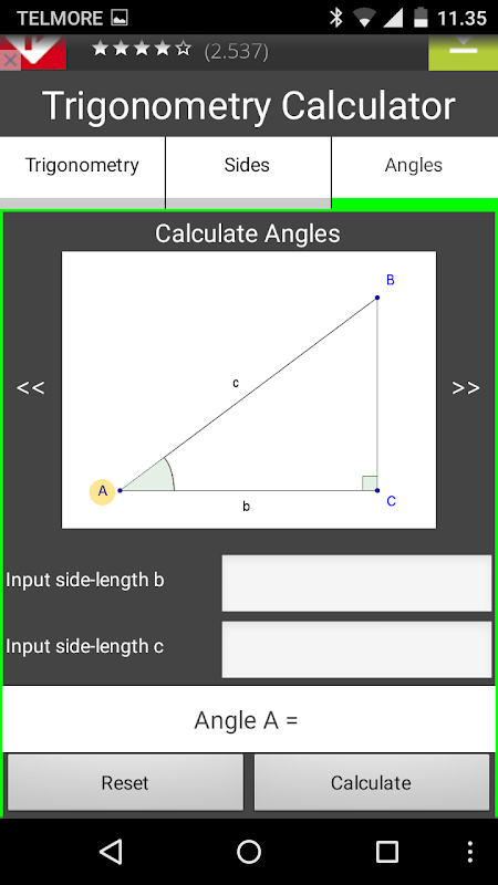 Para el cálculo de ángulos en el triángulo, la calculadora utiliza seno, coseno y tangente.