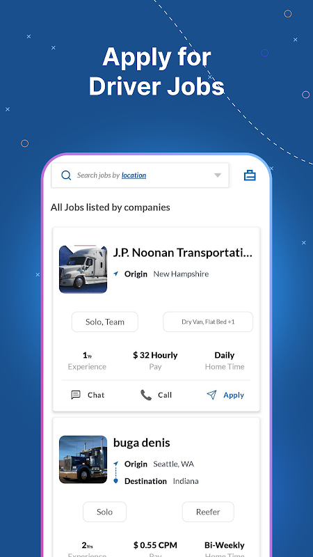 Postúlate a miles de los mejores trabajos de camionero con algunas de las empresas mejor calificadas de la industria, todo en un solo lugar. Acceso GRATUITO para llamar o chatear directamente con más de 3000 empresas de transporte importantes que ofrecen trabajos de transporte bien remunerados en la aplicación.