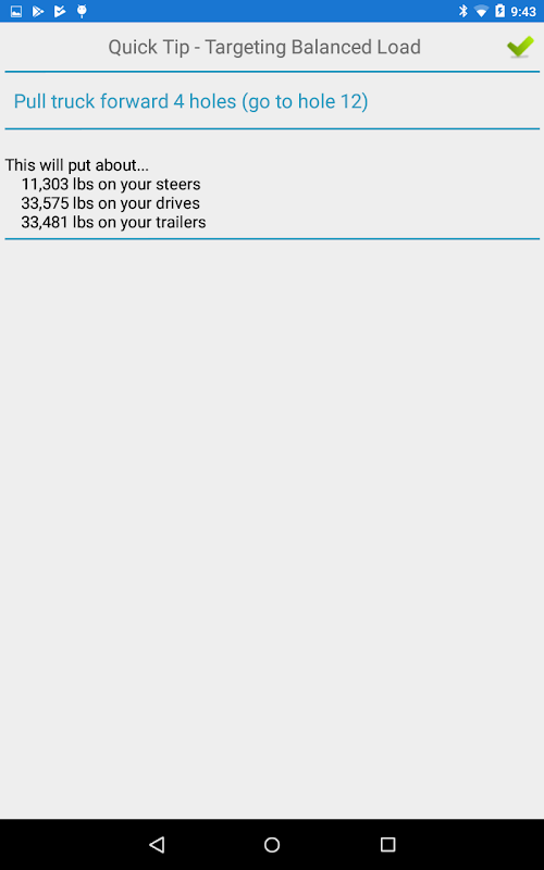 Por último, si cada eje no puede ser legal al mismo tiempo, la aplicación sugiere automáticamente un agujero donde sus remolques estarán justo por debajo de su límite, y pone el resto del peso en sus unidades. De esa manera, puede retirar el combustible adicional y obtener legalidad antes de una escala DOT.