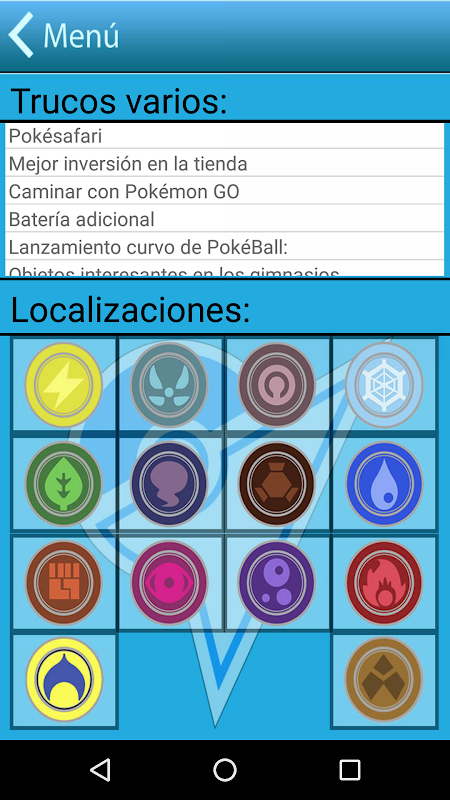 La aplicación Trucos Pokemon GO free es una guía pokemon no oficial, no está autorizada o creada por el creador de la aplicación Pokemon GO. Esta solicitud cumple con los Derechos de Autor de Estados Unidos directrices de derecho de ""uso justo"". Si usted siente que hay un derecho de autor directo o violación de marca registrada que no sigue dentro de las pautas de ""uso justo"", por favor, póngase en contacto con nosotros directamente.
