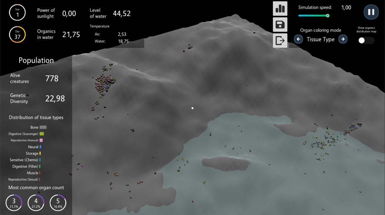 ¿En qué entorno se desarrolla la simulación? Hay un paisaje cuadrado generado aleatoriamente, más allá del cual las criaturas no pueden salir. Está iluminado por el sol, el día se convierte en noche. La energía solar producida por los fotosintéticos depende del brillo del sol. Y el brillo del sol, a su vez, depende de la hora del día y la época del año. Parte del mundo está cubierto de agua, cuyo nivel cambia periódicamente(ocurren mareas). Inicialmente, una cierta cantidad de materia orgánica (microorganismos o simplemente moléculas orgánicas) se disuelve en agua, que puede actuar como fuente de energía para los heterótrofos.