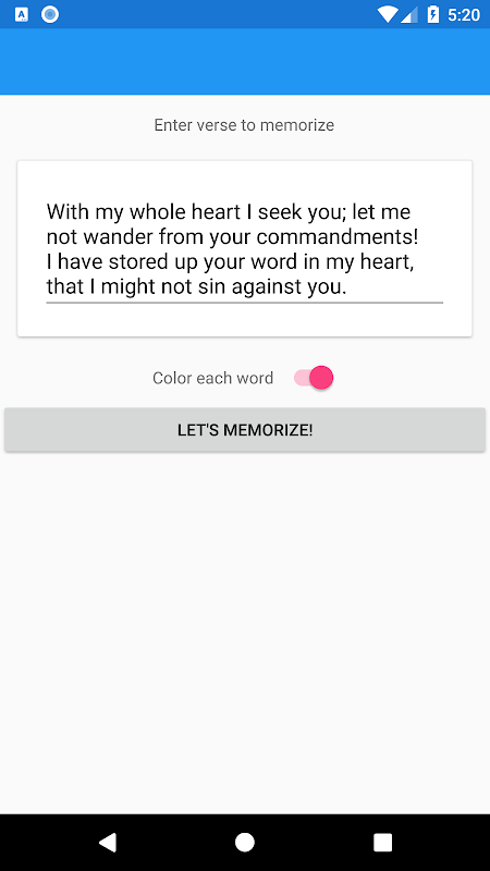 Recita el verso en voz alta, luego toca cualquier palabra para eliminarla y reemplázala con una línea en blanco. Recita el versículo nuevamente y deja que el poder de tu memoria llene los espacios en blanco. ¡Elimina las palabras una por una y memorizarás el versículo antes de que te des cuenta!