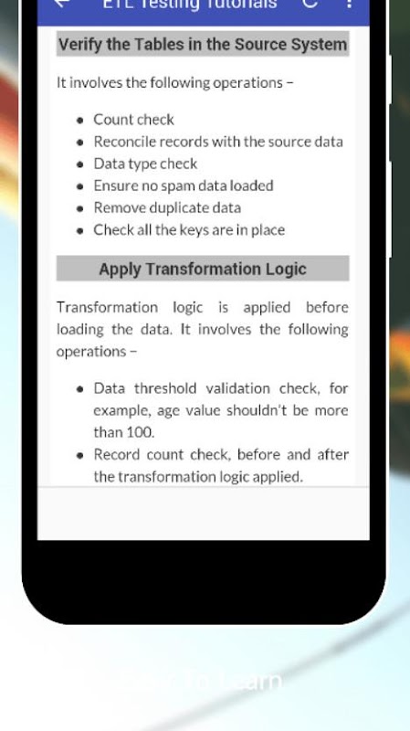 Tutorials for ETL Testing Offline is a complete application for those of you who want to learn ETL Testing easily and for free. There are dozens and even hundreds of ETL Testing tutorials starting to base for beginners to advanced. All these tutorials you can read offline without the need to connect to the internet or mobile data.