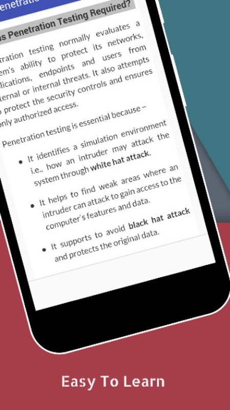 Tutorials for Penetration Testing Offline is a complete application for those of you who want to learn Penetration Testing easily and for free. There are dozens and even hundreds of Penetration Testing tutorials starting to base for beginners to advanced. All these tutorials you can read offline without the need to connect to the internet or mobile data.