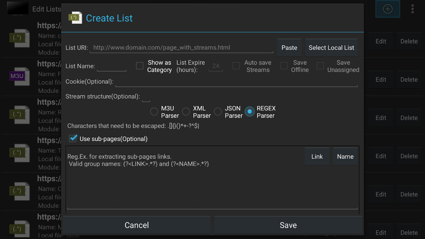 - Extraiga flujos usando un analizador XML, M3U o REGEX,