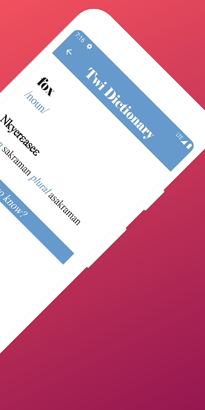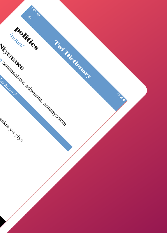 Este es un diccionario completo de inglés a twi (vocabulario) con más de 20,000 palabras y aún contando. Nuestro Diccionario de Inglés a Twi es gratuito y fácil de usar, desarrollado para ayudar a cualquier persona interesada en aprender el idioma Akan.