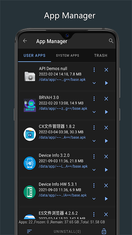 - Mostrar aplicaciones de usuario, aplicaciones del sistema y basura;
