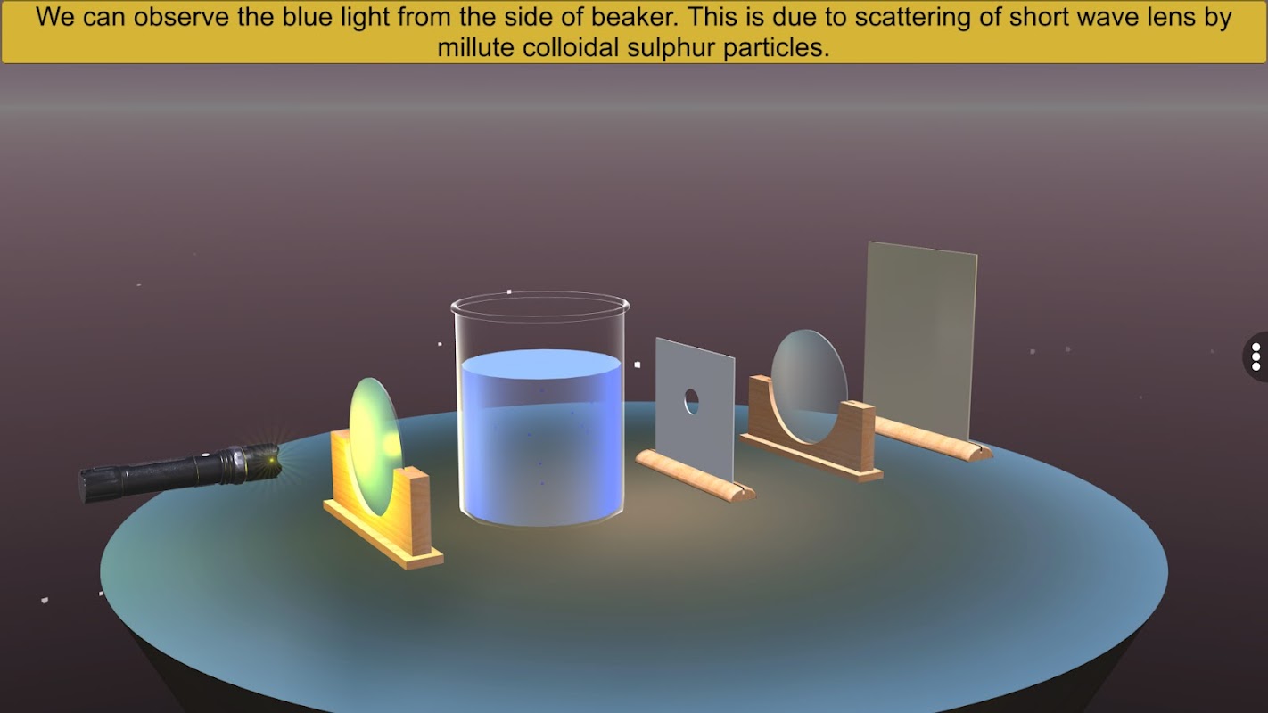 La aplicación "Tyndall Effect" le ofrece una visita guiada para familiarizarse con el experimento de laboratorio que Tyndall Effect. La aplicación pone a su alcance el protocolo paso a paso para el experimento. El “Efecto Tyndall” exhibe todo el aparato necesario para el experimento. Además, la aplicación ilustra todo el procedimiento del experimento para mostrar el efecto Tyndall.