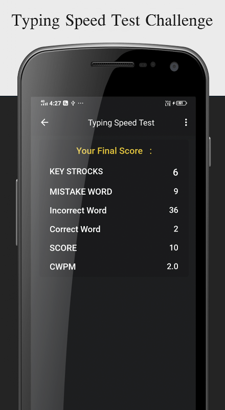 Typing Speed Test es una aplicación muy útil para las personas que desean probar/medir la velocidad de escritura. Le ayuda a descubrir qué tan rápido puede escribir.