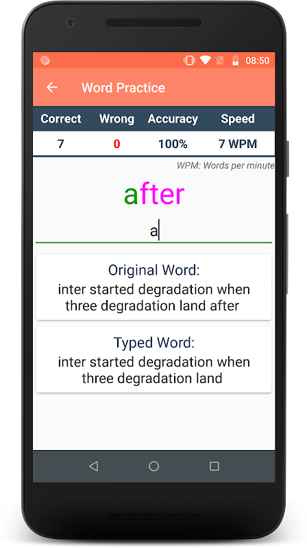 > Práctica de palabras : práctica de palabras con lecciones de mecanografía. Presione "espacio" para obtener la siguiente palabra en la pantalla. Las estadísticas (palabras por minuto, palabras por minuto) mostrarán su precisión en palabras por minuto (promedio de palabras por minuto).