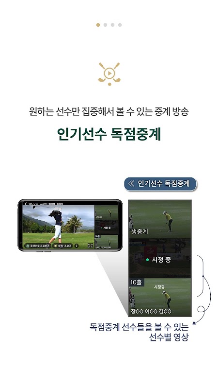 TV 중계 외에 인기 선수들의 경기 영상을 최대 3개 채널로 독점 중계하여 내가 좋아하는 선수의 경기만 갤러리가 된 듯 시청할 수 있습니다.