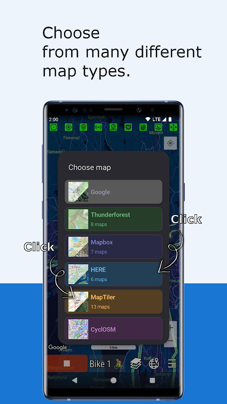• MAPAS: más de 40 tipos de mapas, incluyendo Mapbox, HERE, MapTiler, CycleOSM y otros.