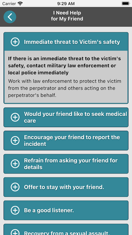 Además, proporciona información sobre las posibles maneras de responder al acoso sexual y asalto sexual. Puede acceder a la información dentro de la aplicación para aprender más acerca de la respuesta asalto sexual, tales como qué hacer si usted o alguien que usted conoce ha sido asaltado.
