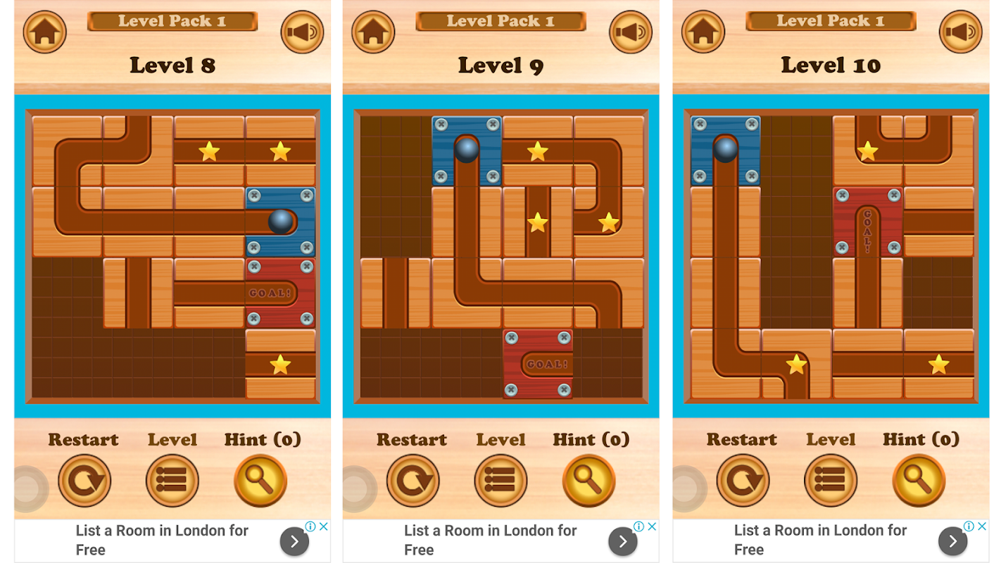 Roll the Ball-Slide Puzzle contains ads varying from banners, interstitials, videos to house ads.