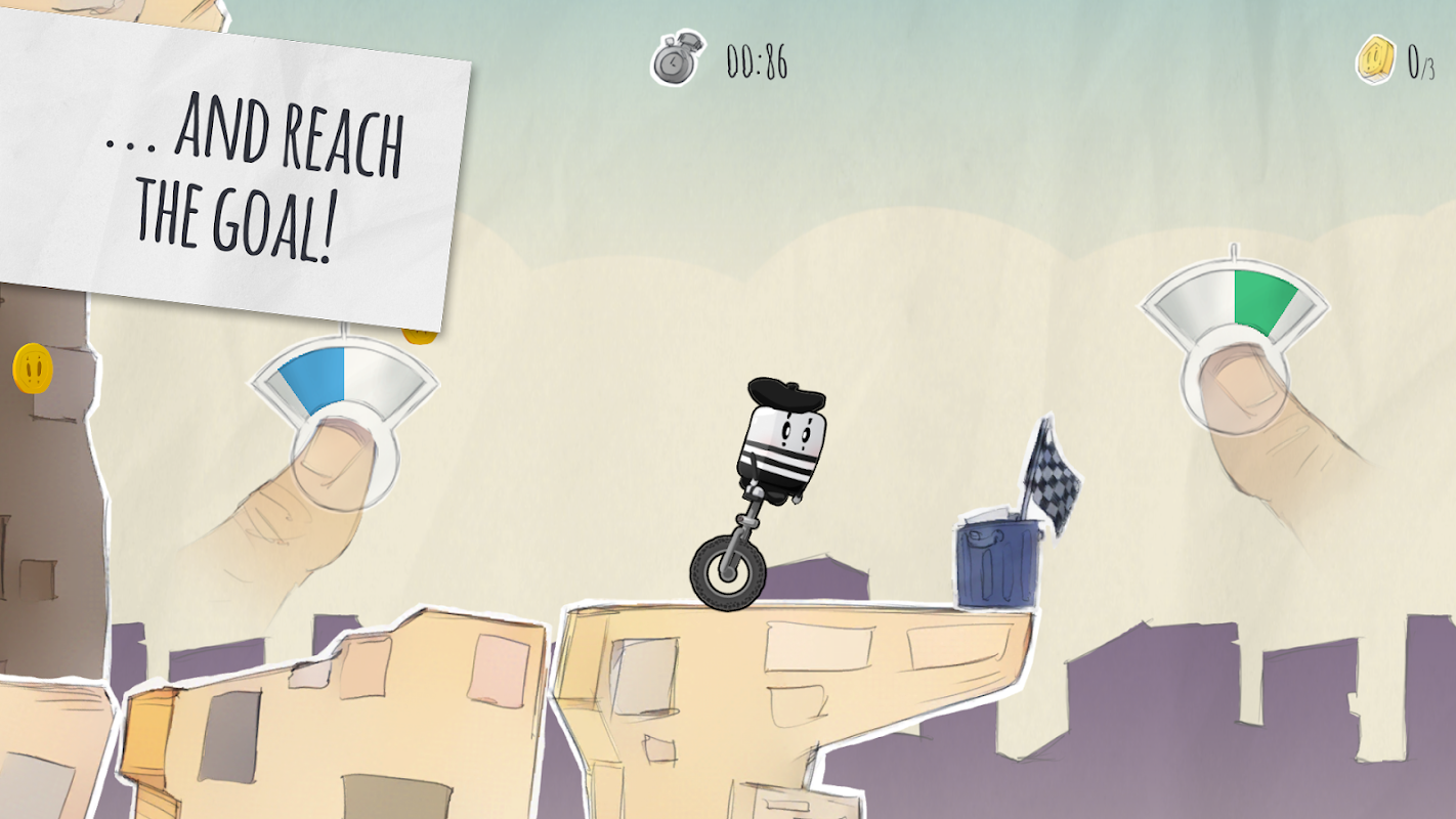 Comienza tu aventura como un mimo promedio, apenas manteniéndote en pie. Domina el arte del monociclo y conviértete en un ninja (o zombi) que desafía a la muerte, sorteando superficies planas y rompecuellos, pequeñas pendientes y cajas del tamaño de una novela de bolsillo.