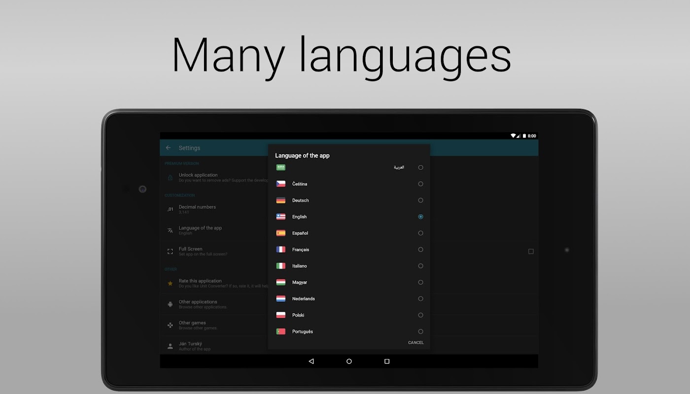 • 15 idiomas: english, Deutsch, slovenčina, čeština, русский, polski, français, فارسی, magyar, español, português, român, italiano, nederlands, 한국어