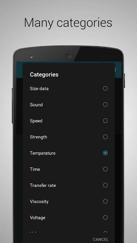 • lista de categorías: temperatura, velocidad, presión, trabajo, volumen, voltaje, velocidad de transferencia, tiempo, área, sonido, radioactividad, ángulo plano, fuerza, potencia, sistemas de numeración, peso, inducción magnética, Brillo, iluminación, longitud, viscosidad cinemática, gráficos, frecuencia, caudal, resistencia eléctrica, electricidad, viscosidad, densidad, datos de tamaño, brillo, cantidad de sustancia