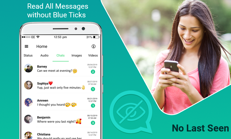 También puede consultar cualquier enlace, video o fotos con el estado en línea Invisible. El visor de estado invisible lo ayuda a escuchar mensajes de audio y obtener una vista previa de videos sin que el remitente tenga conocimiento. La aplicación de chat invisible ocultará las marcas azules de su estado en línea.