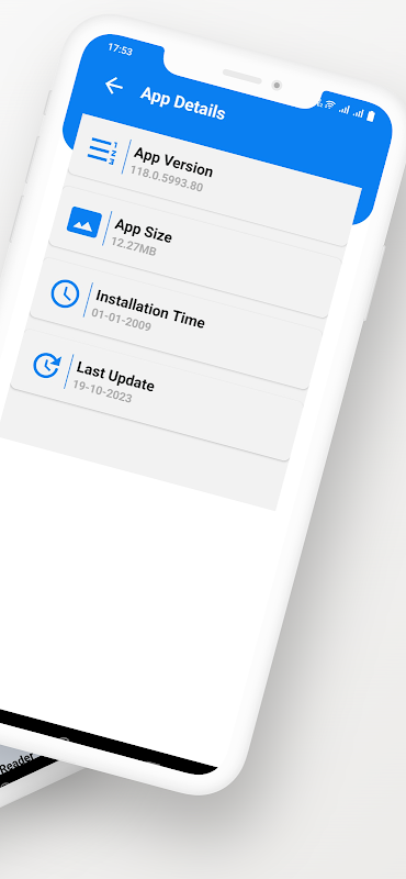 Versión - Tamaño - Configuración de la aplicación - Actualizar software - Actualizar todas las aplicaciones también muestra toda la información del dispositivo, información de la aplicación, incluido el tamaño de cada aplicación, y el número de versión de la aplicación de actualización de software.