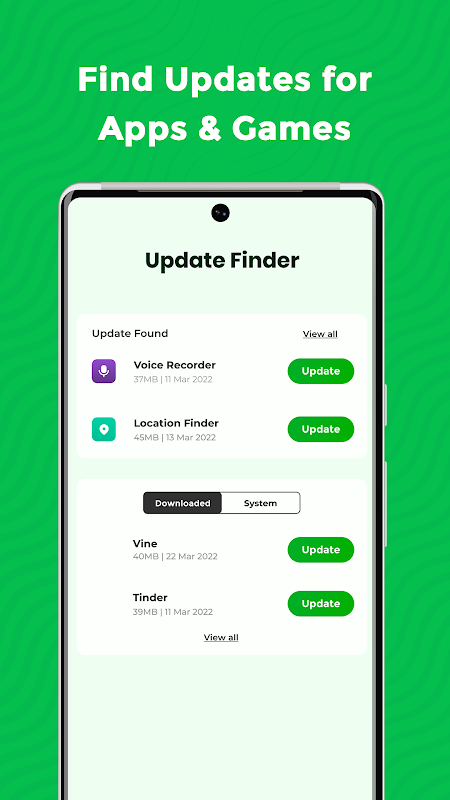 Actualizar software para la actualización de la aplicación Android o la actualización del sistema le permite buscar actualizaciones de software para todas y cada una de las aplicaciones e instalar la nueva versión con un solo toque. Encuentre actualizaciones de software para las aplicaciones instaladas y del sistema. Además, muestra información adicional sobre la aplicación, como la versión actual y los permisos otorgados. El verificador automático de actualizaciones de software o el buscador de actualizaciones busca actualizaciones de software y le notifica tan pronto como estén disponibles.